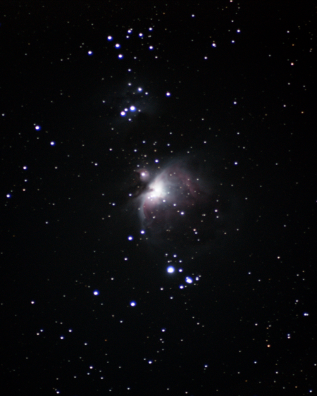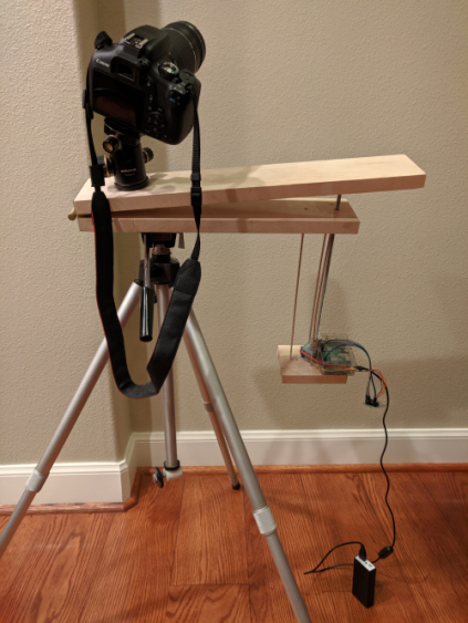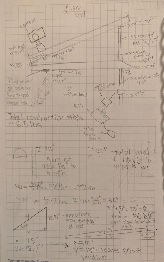 In order to track stars and deep sky objects as they rotate through the sky, the camera needs to follow them. This is done by mounting it on a star tracker which as pointed at one of the celestial poles (in my case the North Pole as I am in the Northern Hemisphere). There are many devices out there that do this but they are all very expensive so I decided to build my own. My contraption is composed of two wooden boards connected by a hinge with the DSLR mounted on top via a ball head mount. The first key component of using the star tracker is that the hinge has to be pointed directly at the North Celestial Pole when in use. Second, in order for the star tracker to work properly, it needs to rotate at the same angular velocity that the Earth rotates at but in the opposite direction. A day is 24 hours long so that angular velocity would be about 1 rotation per 24 hours, right? Initially, I started off with that value but later switched to the more accurate angular velocity of 1 rotation per 1 sidereal day. You can read up more on sidereal time here but basically it is Earth's rotation rate relative to the fixed stars and is used by astronomers. To achieve this angular velocity, the top wooden board is pushed upward by a threaded rod that is being driven by a stepper motor as seen in the picture above. The motor slides up the aluminum rods as the threaded rod is screwed into the t-nut. The Raspberry Pi actively calculates how much to step the motor based on the number of steps for each rotation, the threads per inch of the rod, and the distance it needs to travel upwards every second to maintain the angular velocity of 1 rotation/sidereal day. The math gets slightly complicated, but to sum it up the distance is calculated using trigonometric functions since the wooden boards and the threaded rod form a right triangle. The length of the bottom board is known and the initial distance the threaded rod sticks up is known so they can be used to calculate the angle the top board makes with the bottom one. Every second, the program calculates the new angle the star tracker should be at using the angular velocity. From this, the program uses the inverse tangent function to calculate the distance the threaded rod needs to travel since it knows the angle and the length of the base. It then aggregates this value to the height variable in order to keep track of it so the correct calculation can be made the next time it loops, a second later. My star tracker is controlled through Blynk which is an open Internet of Things platform that alllows me to create a project within their smartphone app that will communicate with my python program to start and stop tracking. The image of space you see above is of the Orion Nebula and was taken with this Star Tracker by taking 150 5-second exposures at a 300mm focal length and stacking them. Without the star tracker, I could have only gone up to a 1.3 second exposure at 300mm which is not sufficient enough to capture dim deep sky objects. This device effectively allows me to take exposures that are about 4 times longer which makes a big difference, especially when using lower focal lengths and being able to lengthen the exposure time. It could allow up to 2 minute exposures at 18mm as compared to 30 seconds without it.