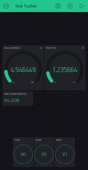 Code for a barn door star tracker enabling you to take longer exposures of the night sky and capture deep sky objects with a DSLR. Runs on a Raspberry Pi connected to a WiFi network, controlled from the Blynk app.