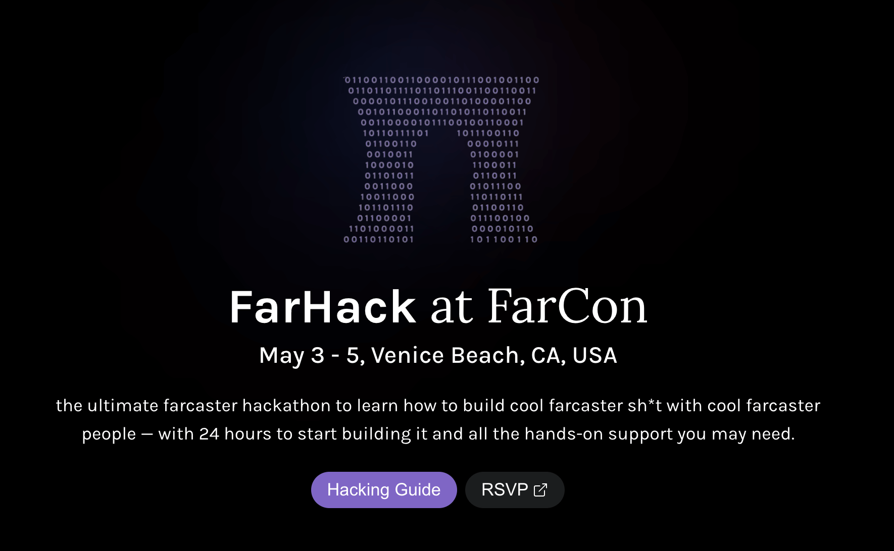 Visit farhack.xyz to learn more about FarHack, which is happening at FarCon from May 3 - 5, 2024 in Venice Beach.