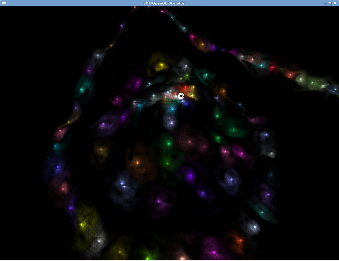 The light sources from a closer perspective. The light source texture is rendered again via instancing. The texture itself is alpha centauri captured from the hubble space telescope, in case you care.