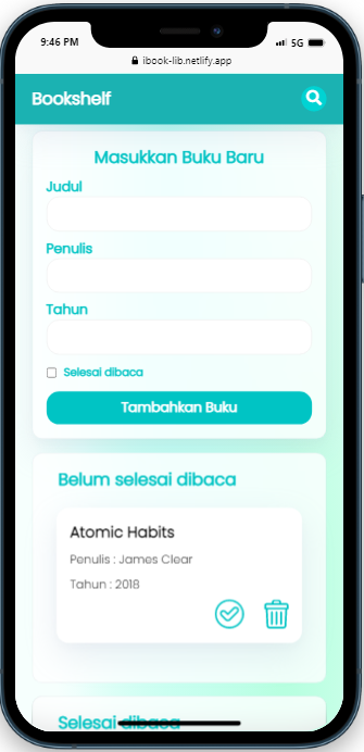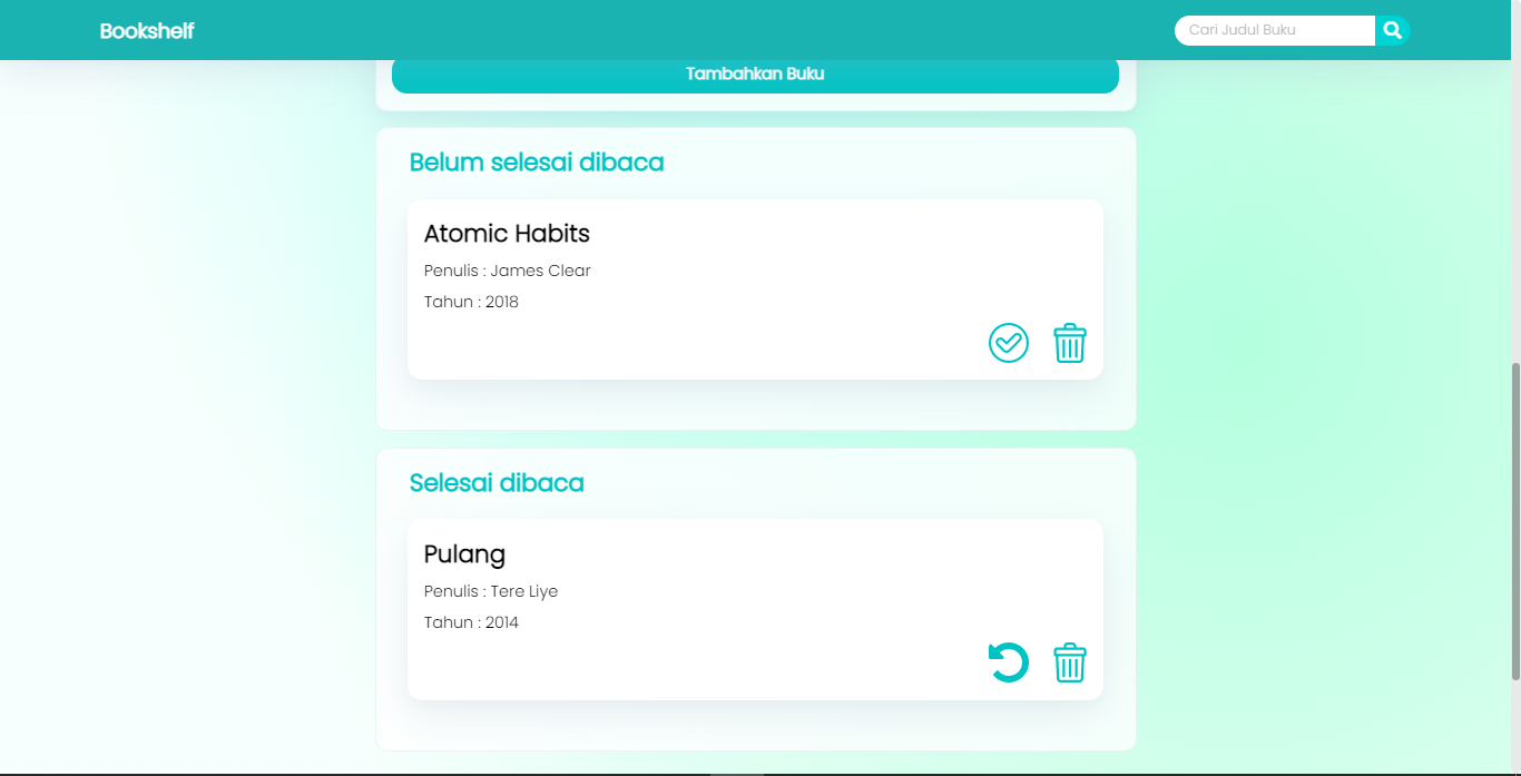 Dibuat dengan memanfaatkan web storage yang ada pada browser, dimana data buku-buku yang ditambahkan akan disimpan ke dalam Local Storage dari browser untuk menjaga data buku tersebut tetap ada sekalipun jendela browser ditutup.