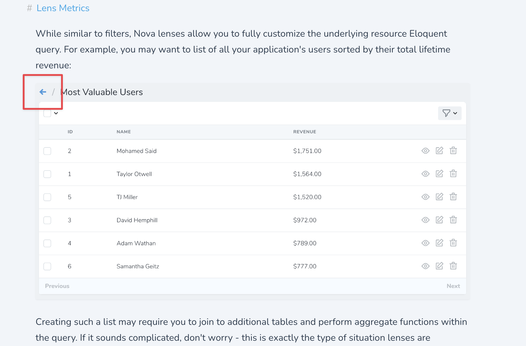 Description:In the documentation there is a back arrow within a Lense, but on my application there is no arrow visible. https://nova.laravel.com/docs/4.0/lenses/defining-lenses.html Detailed steps to reproduce the issue on a fresh Nova installation: