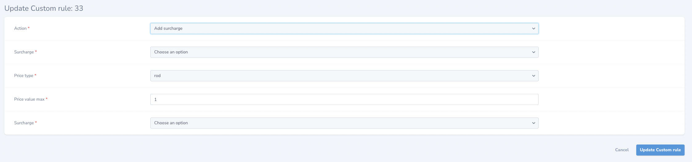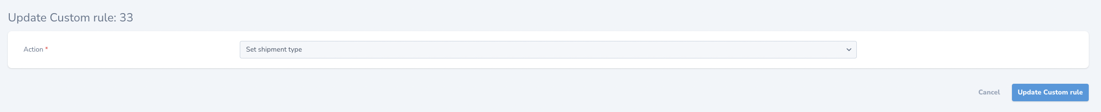 Behaviour after I chose "Add surcharge" option: Behaviour after I chose "Set shipment type" option: Basically fields dependent on action are displayed completely wrong. For "Add surcharge" option you can see both also last Select, where it should not be displayed, and for option "Set shipment type" no field is displayed. |