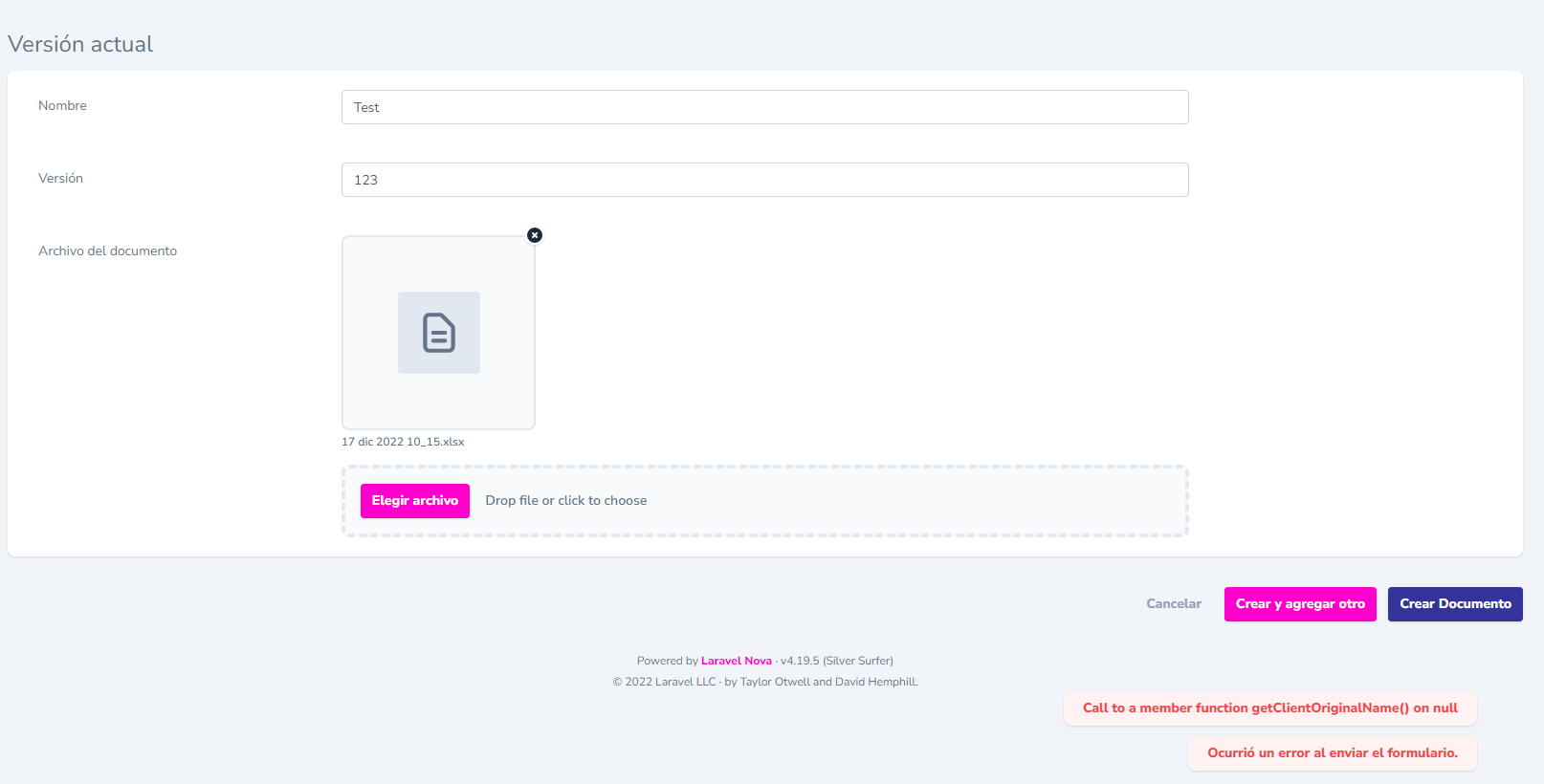 It works when you try to create a DocumentVersion (/nova/resources/document-versions/new), and the original name is stored properly. However, when you attempt to create a version through DocumentHolder (/nova/resources/document-holders/new), this happens: