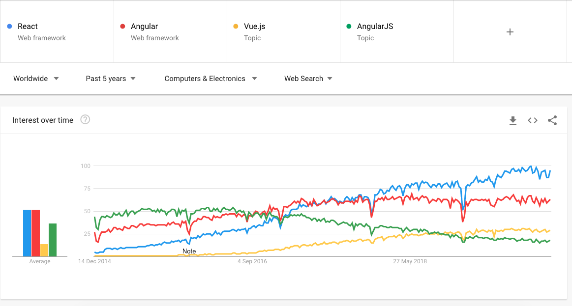 ReactJS and Angular (AngularJS and VueJS not covered here) are the most popular library and framework according to latest Google trends: