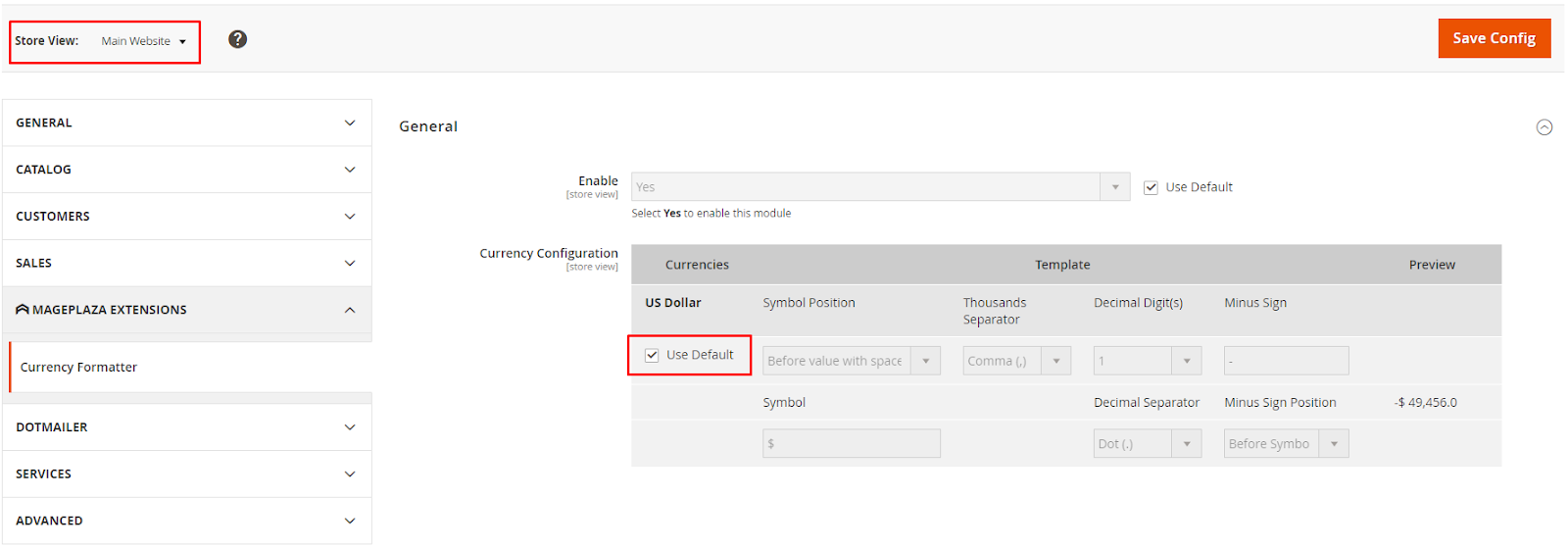 Admin can configure currency format at backend. At Magento Admin, Select Stores > Settings > Configuration > Mageplaza > Currency Formatter