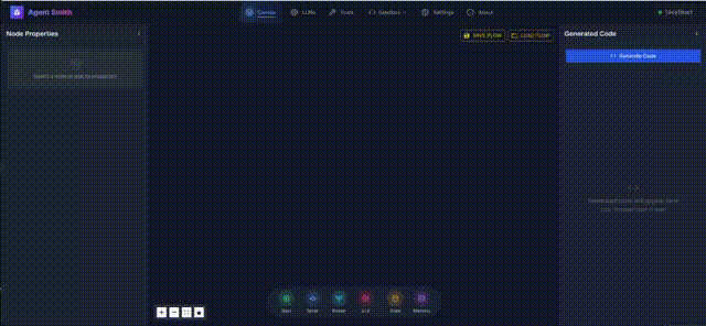 Design intelligent workflows using a drag-and-drop interface, describe flows in natural language, define custom state/message schemas, and generate full runnable Python code. Whether you're using OpenAI, LLaMA, or your own tools, AgentSmith helps you go from idea → graph → working agent in seconds.