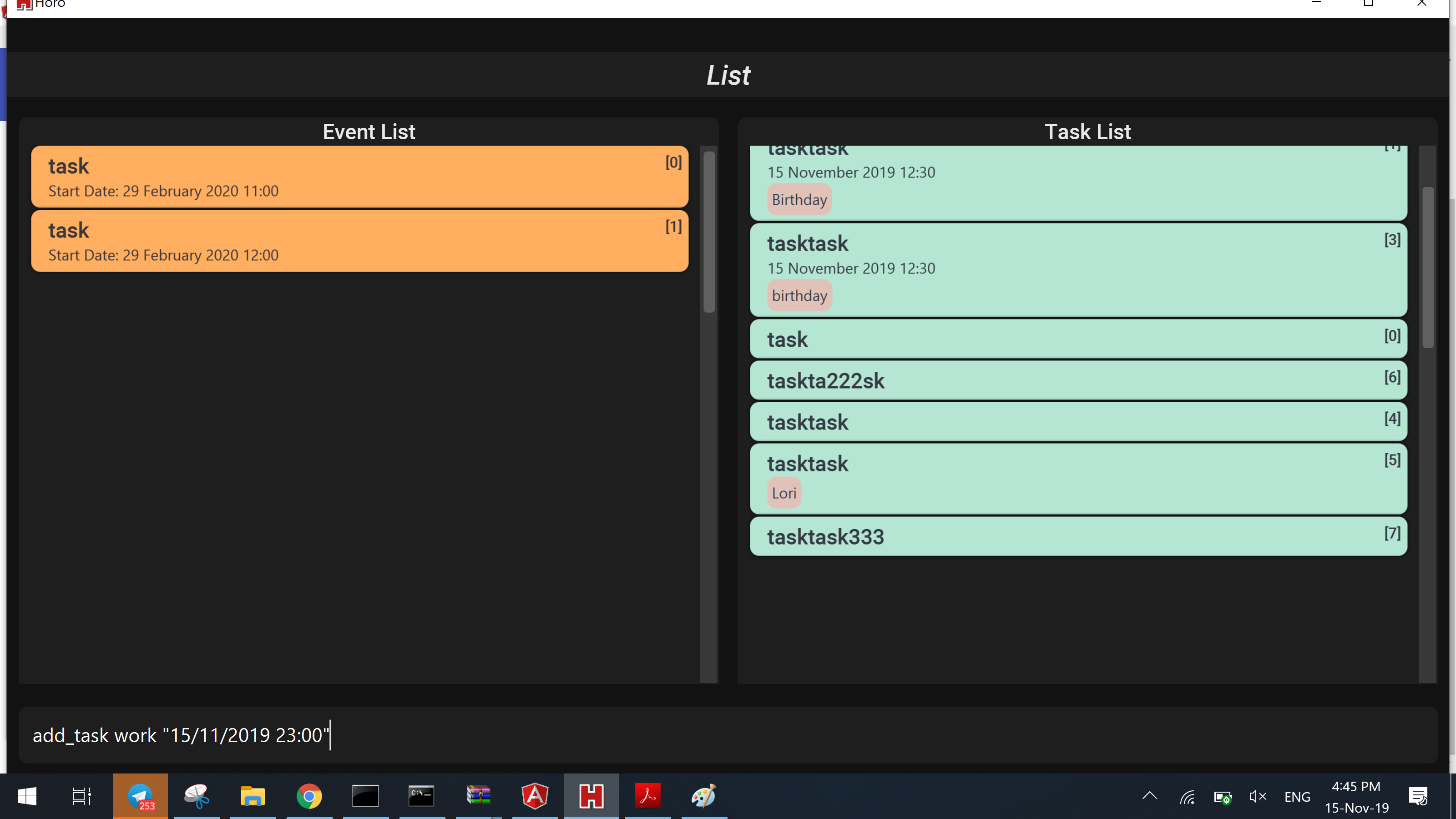 Example below: after adding the task "work" on 15/11/2019 23:00, my attempt to add "work" at 15/11/2019 23:30 shows an error, the task list only showing one "work" entry.
