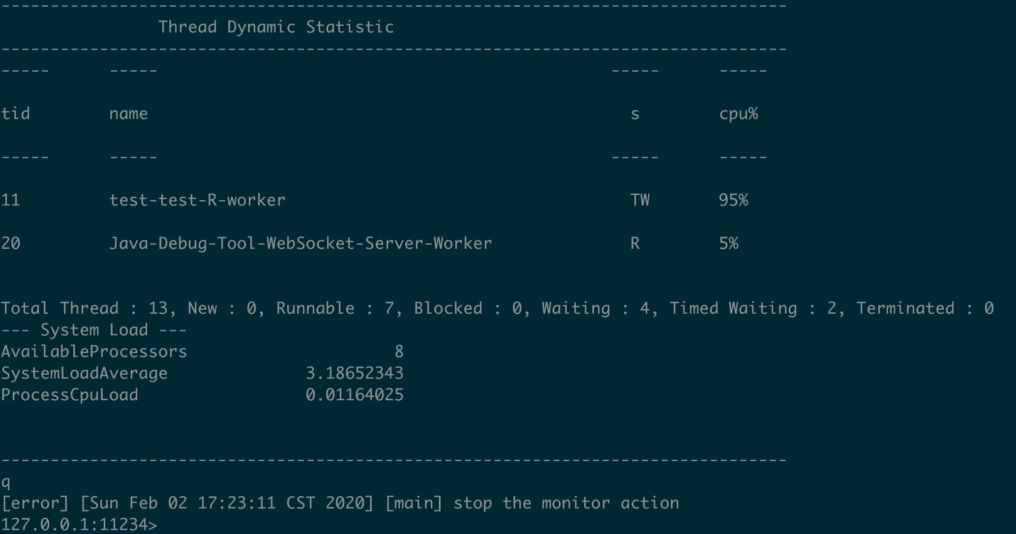 the cputime command can get the cpu usage of the target jvm, the interval is 30 seconds, the base usage of this command is :
