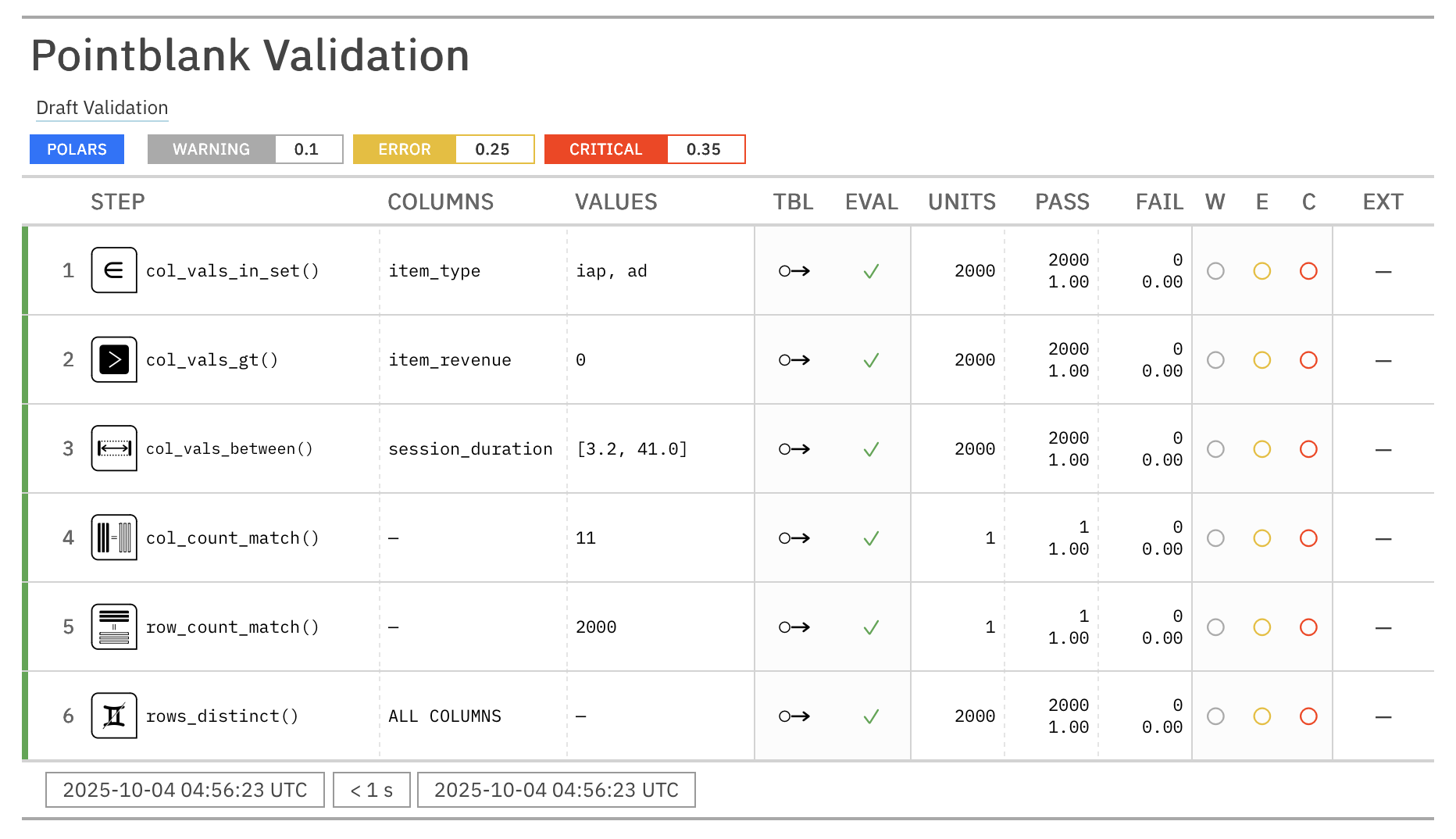 validation.get_step_report(i=3).show("browser") # Get failing records from step 3For teams that need portable, version-controlled validation workflows, Pointblank supports YAML configuration files. This makes it easy to share validation logic across different environments and team members, ensuring everyone is on the same page.