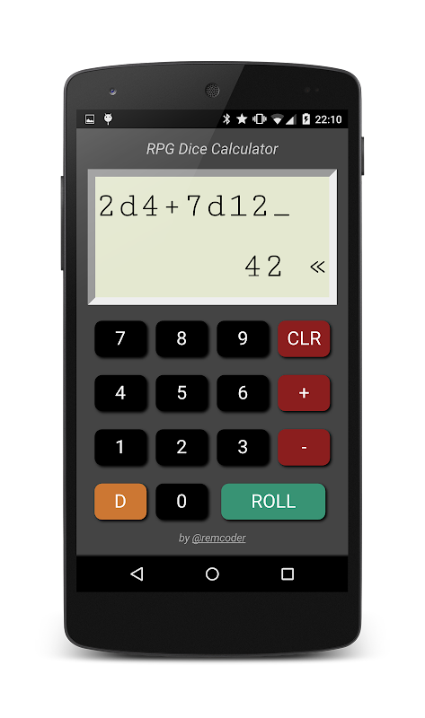Roll any combination of RPG (aka polyhedral) dice, as simple as using a calculator. You can even roll non-existent dice like 1d3 or 1d7! Just enter the formula and ROLL!