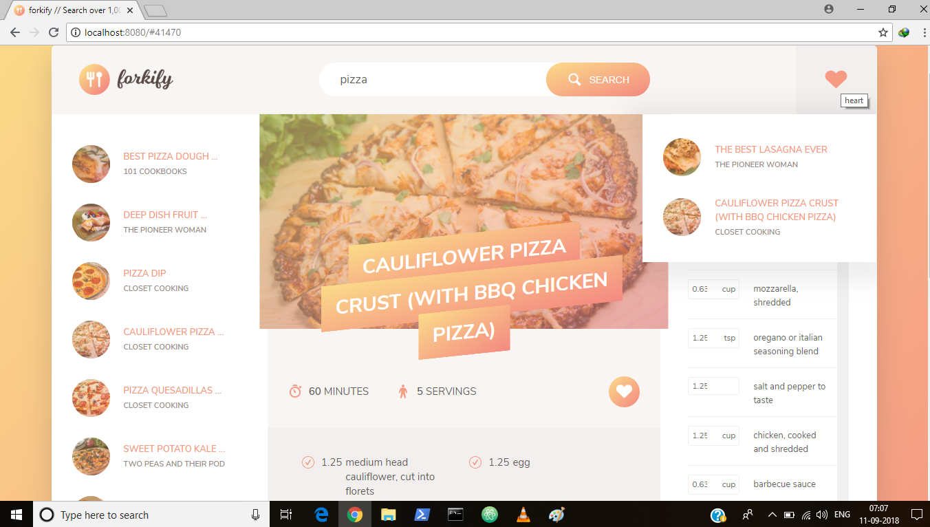 This is a single page recipe application that provides over 1000000 recipes for multiple different foods within categories.The data/recipe are being fetch from food2fork public API. The user will then select the food he/she likes and the recipe view will be shown with much more details. The user will then be able to add the necessary ingredients to shopping cart.The app allows user to like the recipe and stores the like locally in the browser so he/she can later visit and find the liked recipe.