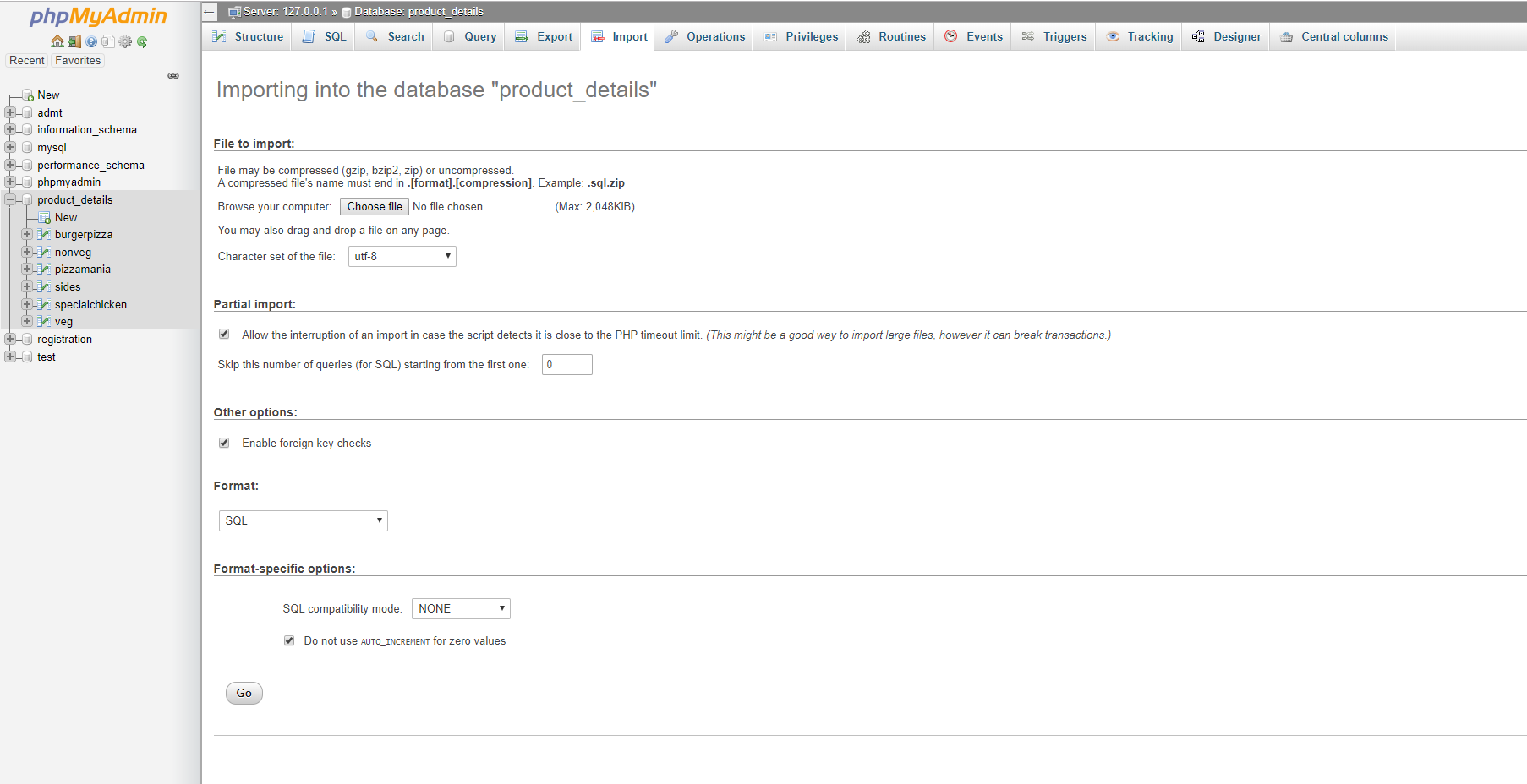 3)Now Create Two Databases named product_details and registration and then import the files(product_details.sql,registration.sql) using insert tab in PhpMyAdmin