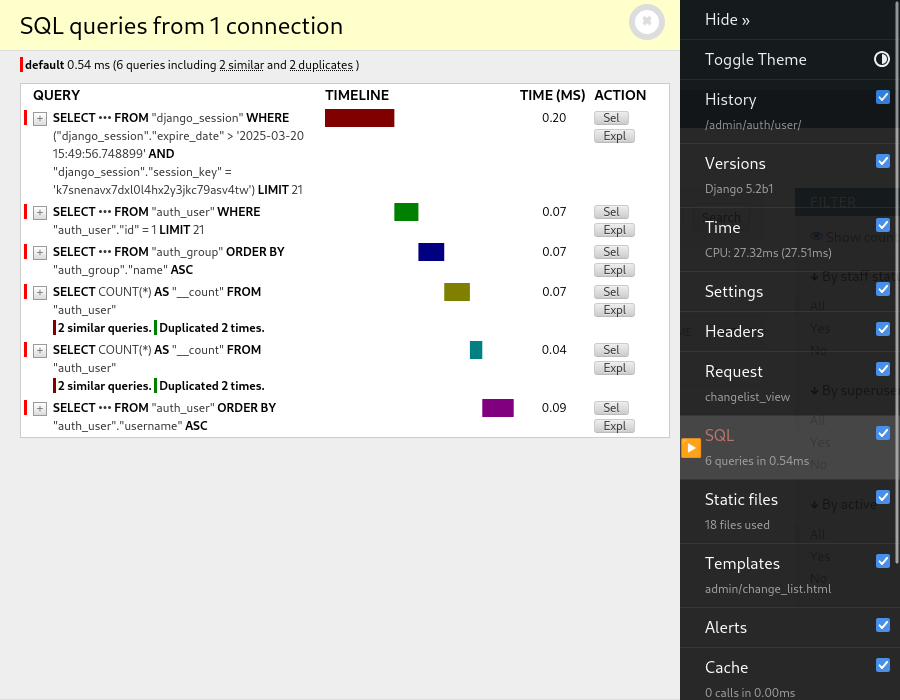 The Django Debug Toolbar is a configurable set of panels that display various debug information about the current request/response and when clicked, display more details about the panel's content.