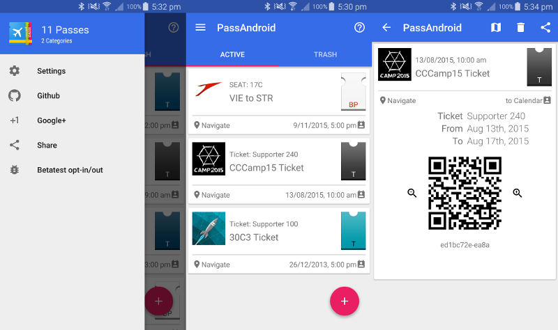 Displays esPass (*.esPass) and Passbook ( *.pkpass ) files & shows the Barcode ( QR, PDF417, AZTEC, Code 39 and Code 128 format ). It useable offline. When preparing for the Chaos Communication Congress 2012 ( #29c3 ) I stumbled upon a passbook file for the first time. As I really like the idea of paperless tickets as it saves time and trees which both are very valuable to me. The problem was that I found no app with which I could use the downloaded passbook file.