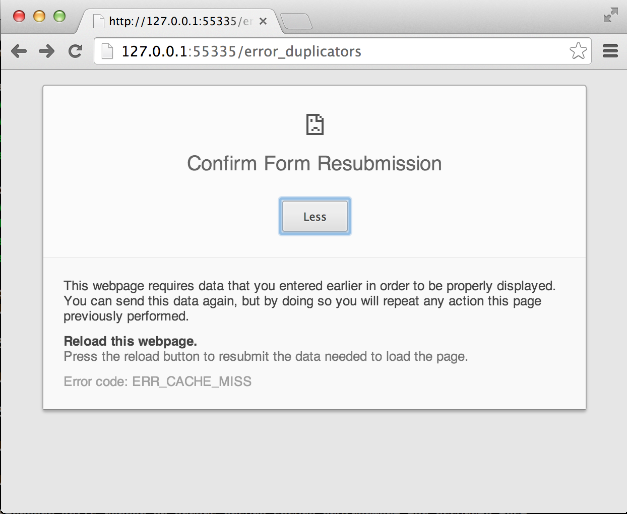 This strategy also has the benefit of being completely uniform across all browsers in behaviour. Before, for instance, Chrome ended on a different page to Firefox when clicking back (one skips a page in history and goes further back, chrome displays with the errors instead).