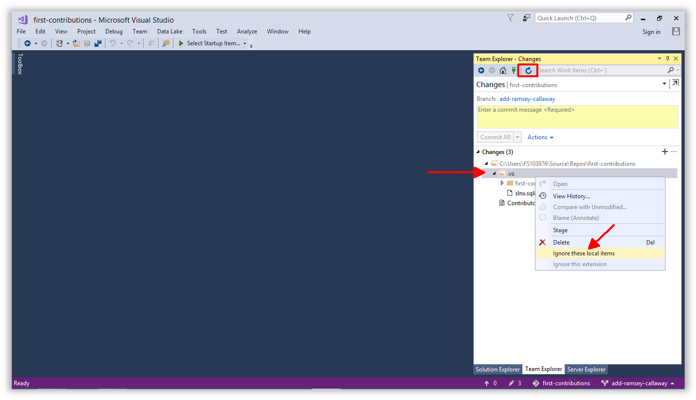 Switch back to Team Explorer and navigate to the Changes view.