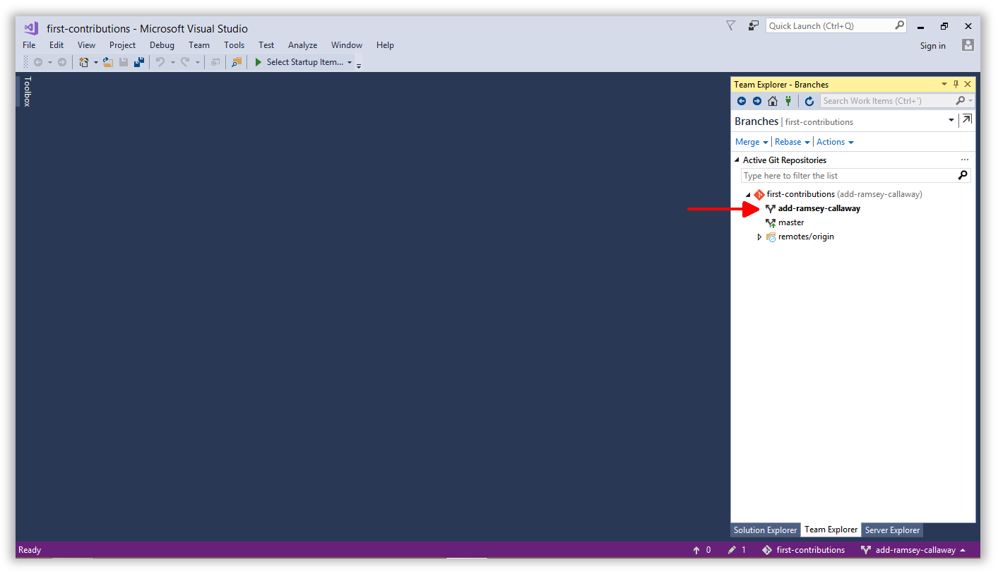 Click back to the Team Explorer tab and use the main navigation dropdown to open the Branches view.