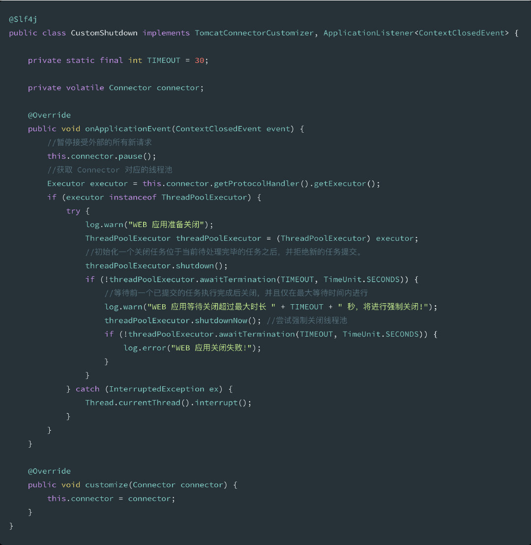 通过定制 Connector 的行为,我们就可以允许在请求处理完毕后进行 Tomcat 线程池的关闭,具体实现代码如下: