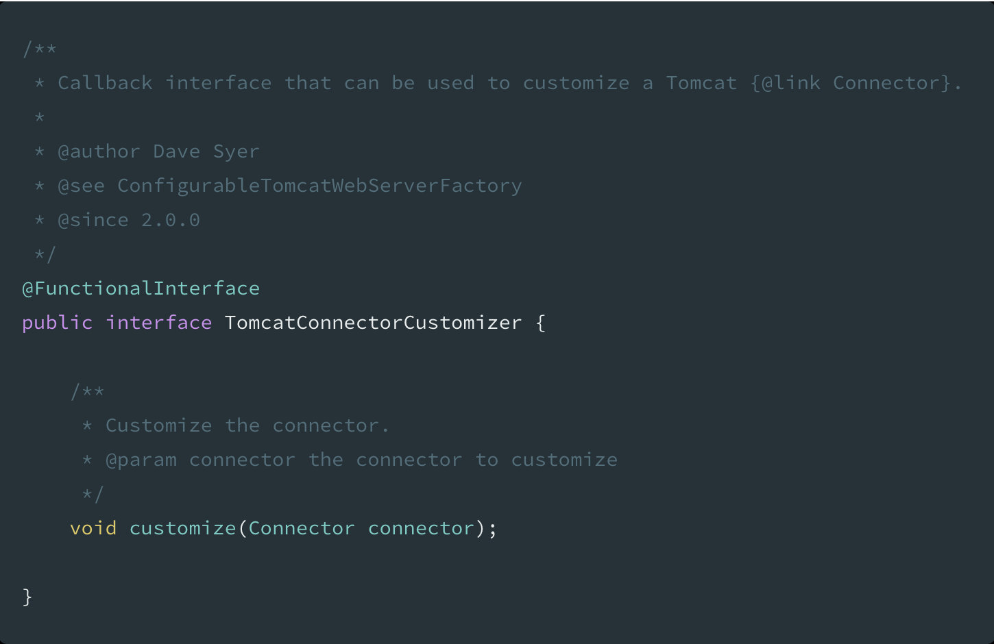 要平滑关闭 Spring Boot 应用的前提就是首先要关闭其内置的 Web 容器,不再处理外部新进入的请求。为了能让应用接受关闭事件通知的时候,保证当前 Tomcat 处理所有已经进入的请求,我们需要实现 TomcatConnectorCustomizer 接口,这个接口的源码十分简单,从注释可以看出这是实现自定义 Tomcat Connector 行为的回调接口: