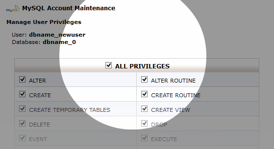 When you click the Add button to add a user to a database, you’ll get a screen where you can assign the privileges for that user & database.